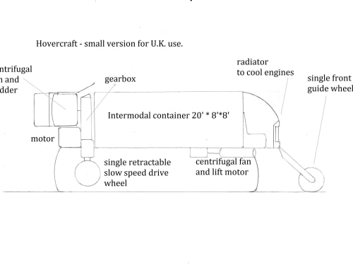 This small version of the hovercraft would be used for transporting one inter-modal container, or curtain sided goods load, or passengers. It would provide efficient transport on motorways and other major roads and would run on alcohol, a clean fuel. Bio diesel, produced from Rape seed oil, would be reserved for farm vehicles.