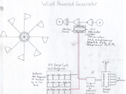 Horizontal cupped blades that spin in any direction of wind. When you are not using electricity, (sleeping or at work) the power meter runs backwards and the Electric Power Company pays you when you supply electricity to the grid. No need for hydro poles in rural areas.