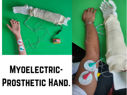 The electronically operated myoelectric prosthetic hand is an innovative device designed to mimic the natural movements of a human hand. It operates using a battery and an EMG (Electromyographic) sensor to detect electrical activity in the muscles. ECG electrodes are placed on the biceps of the user to capture these muscle signals.