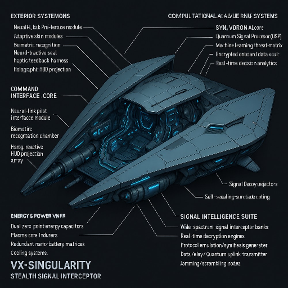 At its core, the VX-SINGULARITY integrates a quantum signal processor (QSP), multi-band antenna arrays, and encrypted neural learning modules. The QSP conducts real-time decryption and pattern recognition of military-grade signals, satellite links, and subspace communications. Powered by hybrid AI/ML algorithms, it autonomously identifies signal anomalies, updates interception protocols, and transmits data securely to remote command nodes.