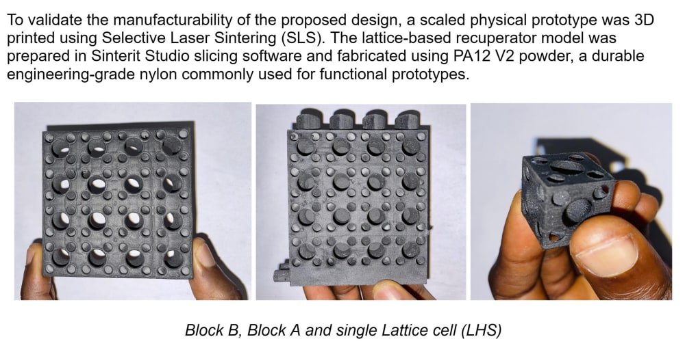 To prove feasibility, a scaled physical prototype was 3D printed using SLS with PA12 nylon, successfully validating the lattice geometry’s printability without supports and demonstrating structural fidelity. This printed model also showcased the design’s ability to withstand post-processing like sandblasting—a critical feature for real-world AM applications.