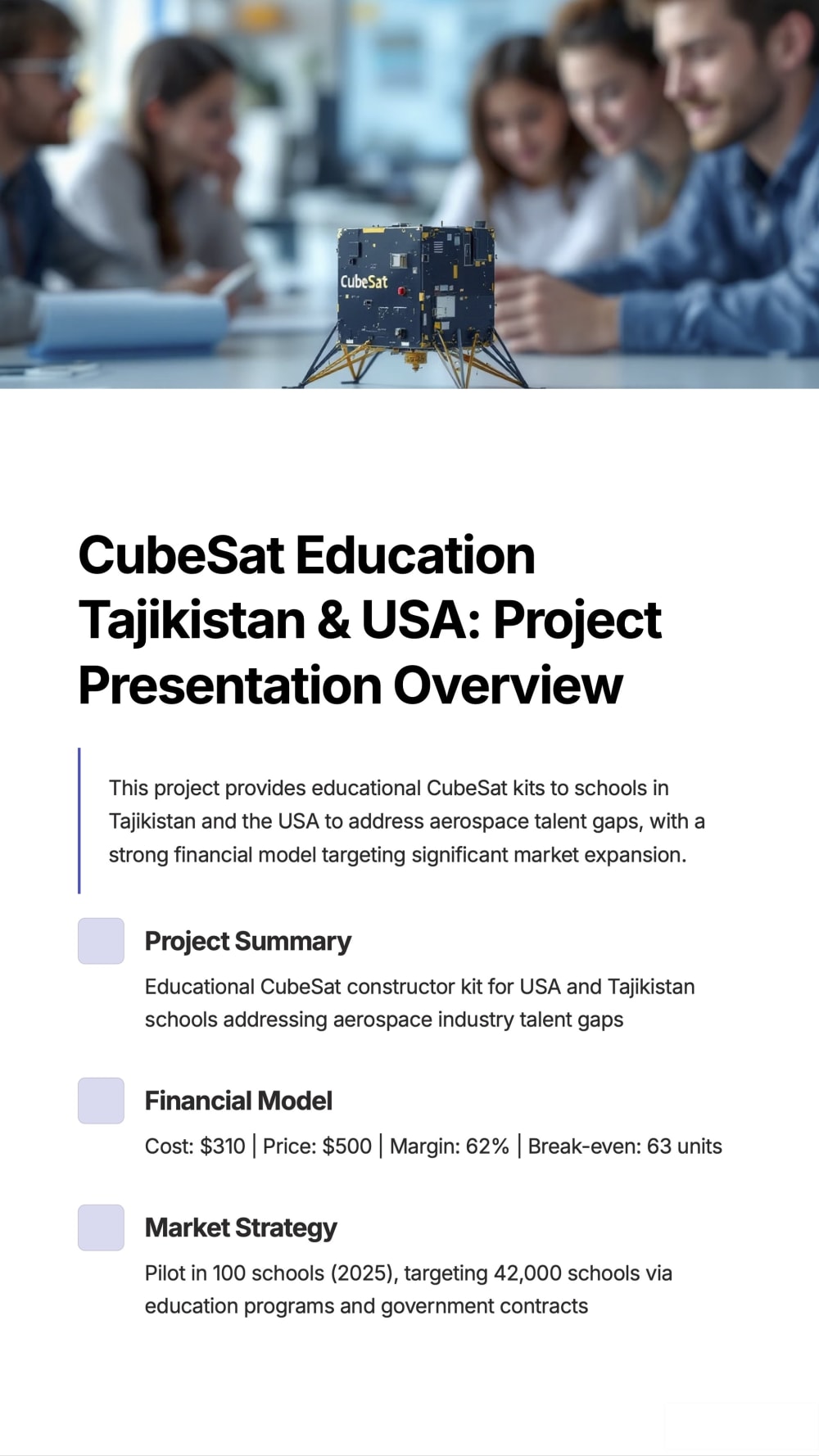 It is also planned to create an affordable, multifunctional and practical educational satellite constructor that will allow students to learn the basics of space technology, radio electronics, programming and data processing.