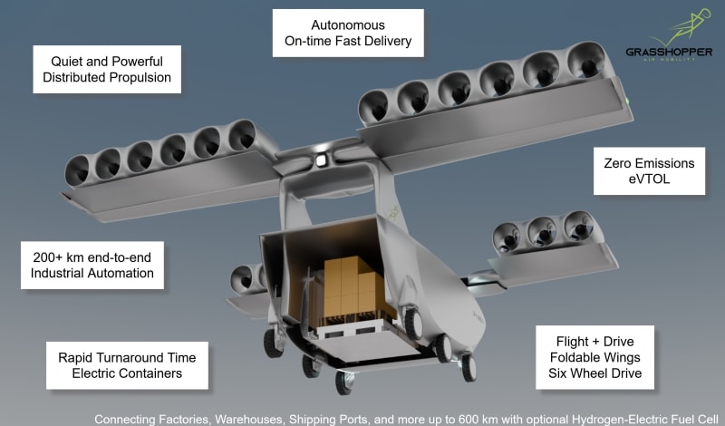 Grasshopper Air Mobility’s fully autonomous VTOL (Vertical Take-off and Landing) fly+drive drone solution, we flipped the “flying-car” on its head, we merged anywhere aerial logistics and last-mile. We are developing an unmanned aerial system with precision drive and swappable electrified cargo containers. To achieve 2028 first flight targets, we limited useful battery range to 200 km, speeding pick-up to drop-off within 1 hour. We believe flying cargo will happen far earlier than no-pilot human transport. Scaling up from current regulatory approved delivery drone logistics, we want to leap past current 300-400 kg payload electric aviation designs (like Joby, Archer, Beta, etc.) with economic benefits to have ground pilots monitor fleets and accelerate towards far lower shipment costs. We are partnered with Schubeler Electric to select safely redundant distributed electric propulsion systems. A multi-pack battery system within the vehicle and the swappable electrified cargo container; we ensure pre-loaded and pre-charged containers minimize down-time and maximize vehicle utility. A robust pallet (just-in-time) logistics system with up to 10x daily trips compared to today's ground vehicles.