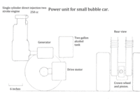 My version is to be fuelled on alcohol, but this would not be possible with a conventional two stroke engine as the oil would not mix with the alcohol. A direct injection two stroke is to be used, the same as a diesel electric locomotive. This has good crankcase lubrication, the advantages of a lean burn direct injection engine, and only one cylinder is needed – a light weight design. The toothed belt drives the water pump, the air blower, and the camshaft.