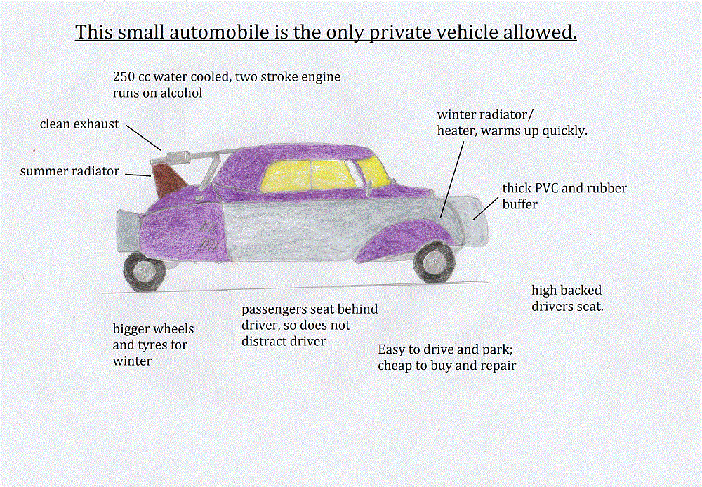 This vehicle is to be the only vehicle allowed for the general public, available in a multitude of colours. This would result in a standard bumper height for impact resistance. It would also stop people racing each other on the roads, reduce average speeds and therefore allow cycling again, and walking, as no pollution is produced. A taxi version would take one person. All the large motor manufacturers would be required to cooperate in designing and producing it.
