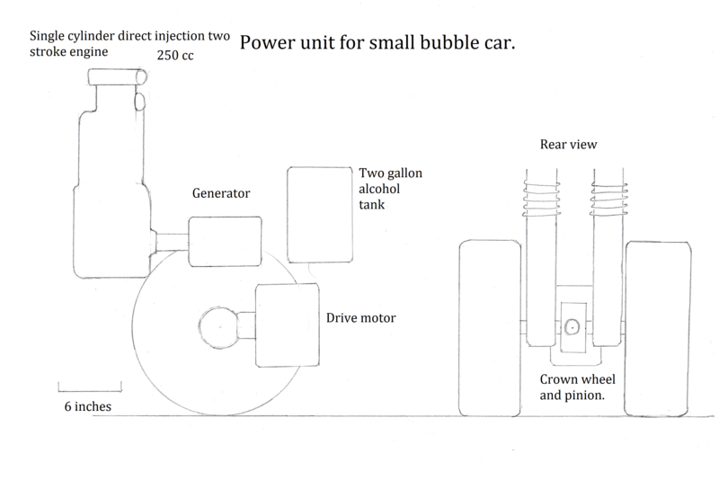My version uses a hybrid drive, which eliminates the need for a gearbox. It improves efficiency when starting from rest. The single cylinder engine warms up quickly with water cooling to give an efficient heater, and a quiet drive. A conventional four cylinder used for an average short journey does not warm up quickly and is very inefficient.