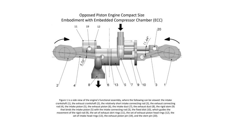 Unlike many OP engines requiring external compressors, this design incorporates an embedded compression chamber via a novel piston-cylinder combination. This enables the engine to perform the full thermodynamic cycle—intake, compression, combustion, and exhaust—with enough sweep and boost pressure for clean exhaust and effective power delivery on each revolution.