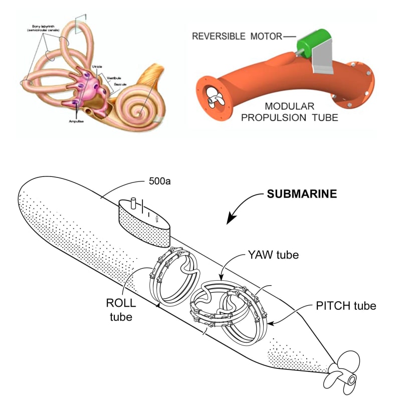 The steering of the submarine can be simplified using mutually-perpendicular propulsion tubes. The absence of rudder and hydrofoils eliminates two of the three sources of cavitation, which gives away the location of the submarine to the enemy. I am offering this technique for license to entertainment companies (including Universal, Disney, MSG (that built The Sphere theater in Las Vegas)), and to the Navy and submarine-engineering companies including General Dynamics, Northrop Grumman, Raytheon, etc.).