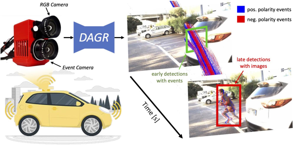 Our invention, DAGR, published in Nature, addresses this challenge by combining a traditional low-framerate camera (20 FPS) with a bio-inspired event camera for high-speed traffic participant detection with the latency of a 5,000 FPS camera but 100 times less data. Event cameras, inspired by the human retina, have independent motion-sensitive pixels that only transmit sparse and asynchronous data, called events. These events efficiently capture high-speed motion patterns in the blind time between images, with microsecond latency, low motion blur, and a high dynamic range. Thus, DAGR improves detections especially during challenging high-speed motion, and lighting conditions, at night, when exiting a tunnel, or during sunset, where traditional cameras suffer from saturation or blur.