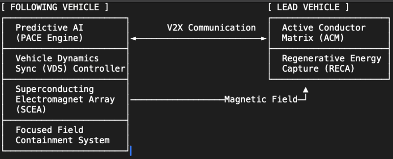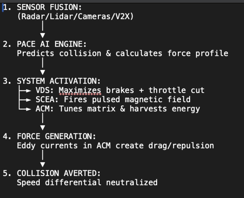 Powered by an AI Predictive Collision Engine (PACE), the system detects imminent collisions faster than human reaction times. When a crash threat is identified, it fires precision-shaped magnetic pulses toward the lead car. This triggers powerful eddy currents in the lead vehicle's matrix, generating a physical repulsive/drag force that synergistically amplifies the following car's braking power.