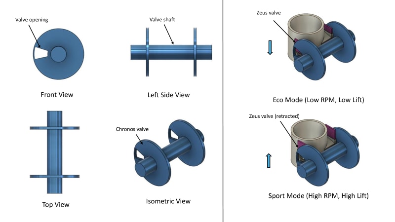 Additionally, the ECU controlled Zeus valve (sliding flap valve) can alter the timing and amount of intake/exhaust gases entering the cylinder by changing the shape of the port opening. This enables Variable Valve Timing and Lift. While systems like VTEC or Camtronic require complex, heavy cam profiles, the CVCS offers a much simpler solution.