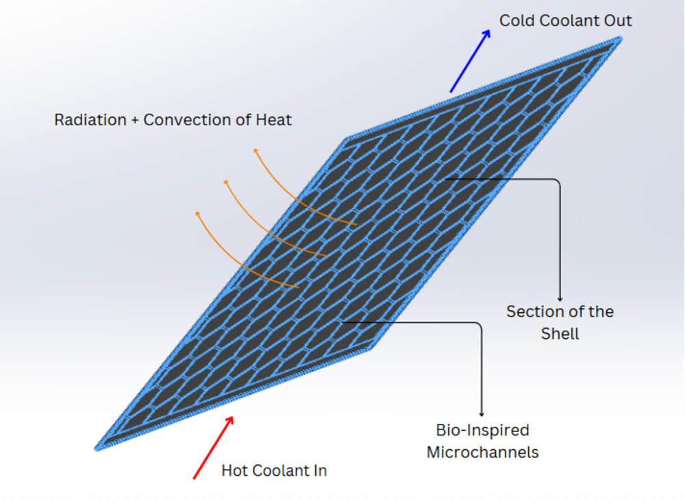 This design introduces an innovative, bio-inspired thermal management system by embedding microchannels directly within the outer shell of the aerodynamic vehicle. The coolant flows through a honeycomb-patterned microchannel network, enabling the shell to serve as both the structural and thermal interface with the environment. This dual-purpose approach significantly reduces system weight, eliminates the need for bulky ancillary cooling units, and leverages the shell’s large surface area and exposure to the external infrastructure for passive heat dissipation.