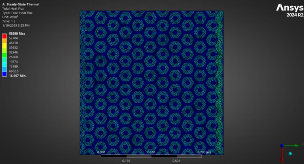 A simplified 1 m² section of the shell was simulated using Aluminium 6061-T6, chosen for its high thermal conductivity (155.3 W/m·°C), low density, and strength. The microchannel geometry (1.004 m × 1 m × 0.015 m) showed promising results in steady-state thermal analysis. With an inlet water temperature of 100 °C, the system stabilized at 48.29 °C, achieving a 10°C reduction in coolant temperature. Heat flux ranged from 254.94 to 559,190 W/m², validating the concept’s effectiveness despite simplified assumptions that excluded convective and radiative effects.
