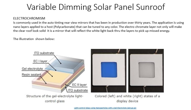 New clear solar panel roof for all automotive vehicles allowing transparency for optimum comfort viewing that can become solid or dimmed for privacy. The entire roof panel is multilayered IR and UV solar arrays with the inner most panel having an electro-chromate film to reflect the unused IR and UV light rays back thru the solar array for maximum energy pickup.