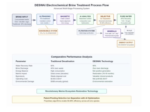 Problem Solved: Current desalination technologies recover only 60% potable water from seawater, while 40% concentrated brine loaded with pollutants is discharged back to marine environments, killing underwater vegetation and fauna. These toxic discharges create dead zones persisting for decades. Additionally, conventional methods consume massive energy and produce waste,