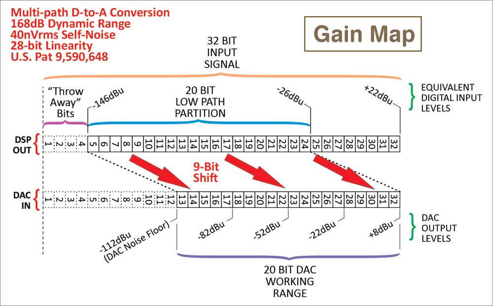 In brief, Multi-Path topology breaks an incoming audio signal into 2 or more dynamic pathways. The lower pathways are managed for extreme low noise, while the higher pathways are managed for extreme high levels. Combining these pathways results in an audio dynamic range in excess of 28-bits, or 170dB. Today's very finest DAC's rarely achieve anything close to 130dB. These improvements are entirely a result of a profound reduction in electronic self-noise (reducing today's common 4.0uV to an astonishing 40nV, broadband, unweighted).