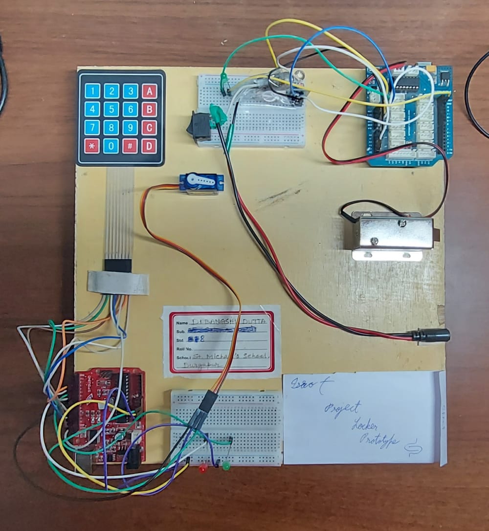 Project Locker has two parts, the first part leads the way two the second part. In the 1st part we enter the password and once it is given and if the password matches the the servo motor will turn and let us access to the 2nd part ( In the prototype picture there is no door like structure which will open, in the prototype the parts and it's working is only shown. ). In the 2nd part , the surrounding area has to be dark, in it there are two lights close to a ldr, one of the light has to be switched off manually and the other has to be blocked by a card. If there is no light around the ldr the solenoid lock opens or else if the ldr senses light then it is kept closed.