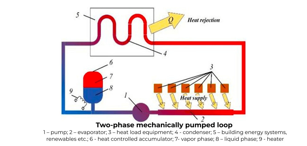 Two-phase mechanically pumped systems (2PH-MPL) have a low overall thermal resistance for heat dissipation to the environment, enabling year-round operation in free cooling mode (without chillers), achieving PUE values below 1.03–1.1.
