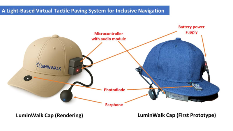 The LuminWalk cap includes a photodiode, a low-power microcontroller, and an earphone to demodulate and convert the light signals into real-time audio feedback for navigation. This solution does not rely on smartphones or large AI models, making it simple and power-efficient. Furthermore, it offers a wider coverage area than conventional tactile paving, as each modulated light beam can cover several tactile tiles per lamp.