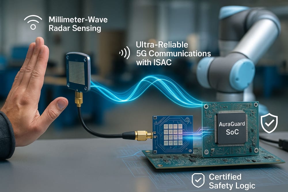 AuraGuard 5G‑ISAC System-on-Chip is a single system‑on‑chip that fuses millimetre‑wave radar sensing, ultra‑reliable low latency 5 G communication and safety‑certified logic, transforming every collaborative robot into a perceptive, context‑aware teammate. A 100 MHz, 60 GHz OFDM waveform simultaneously illuminates operators’ hands for sub‑centimetre gesture capture and transports encrypted emergency‑stop packets with sub‑50 ms end‑to‑end delay, compressing cameras, LiDARs and fieldbus lines into one radio.