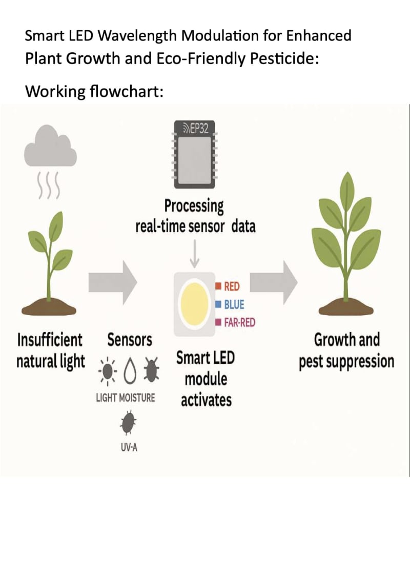 This project introduces an intelligent, solar-powered LED modulation system designed to optimize plant growth and offer sustainable, chemical-free pest control. The system operates autonomously, using sunlight as the power source and a programmable controller (ESP32) to adjust LED wavelengths and intensity depending on environmental conditions.
