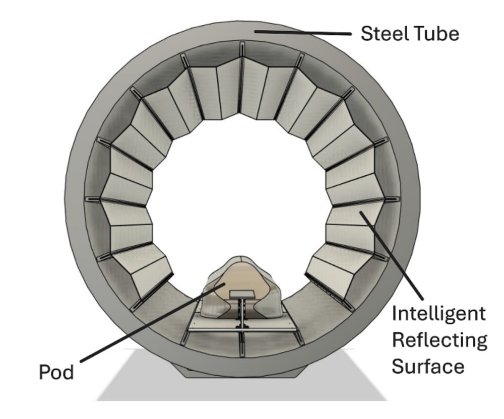 IRS panels work in concert with base stations distributed throughout the tube, which are interconnected via an optical fiber backbone. This setup ensures that high-capacity, low-latency data can be delivered to and from the pods without relying on external wireless networks. A centralized control system coordinates the IRS panels and base stations, continuously optimizing signal paths as the pods move at high velocity. This dynamic adaptation effectively counters Doppler shifts and prevents signal loss, ensuring seamless handovers and uninterrupted connectivity throughout the journey.