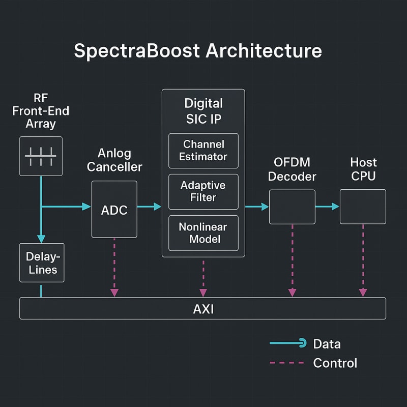 Today’s 5G hardware is confined to half‑duplex Time/Frequency‑Division operation. SpectraBoost eliminates that limitation by tightly integrating multi‑tap analog cancellation, a pipelined LMS/RLS adaptive engine, and nonlinear polynomial modelling inside a single RTL IP. Unlike lab demos that depend on external DSPs, the design fits a mid‑range Multi-Processor System-on-Chip with results which are ncy, boosting safety and productivity. Society: Broader rural broadband, lower CO₂ per bit, and faster emergency networks. The addressable market—US $1.4 B in 5G small cells and repeaters—is growing at 17 % CAGR. A pay‑per‑unit licensing model lets vendors break even in under six months.
