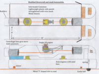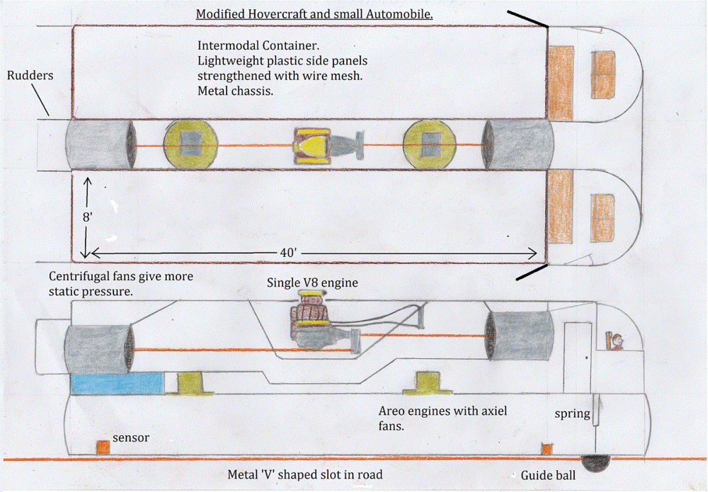 Large trucks produce excessive greenhouse gasses due to inefficient reciprocating engines and complicated gearboxes. This hovercraft would be much better because it eliminates friction with the road surface due to flexing tyres and suspension. It can also run on alcohol, a non fossil fuel, which can be produced from corn. (Grapes that are now used for wine must be used to make alcohol; wine can be made at home from any fruit). There are also problems extracting oil for diesel. This hovercraft can also travel over open prairie, across estuaries, and up rivers. (It may have an agricultural use and also be good for desert areas). It would also reduce wear on a normal road surface. It would be guided by a concrete 'V' shaped groove sunk into the road surface, which would also carry a signal to be picked up by a sensor. This would eliminate driver fatigue on long journeys. It would not pollute the atmosphere.