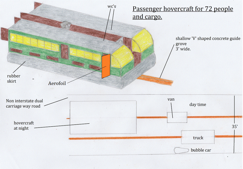 This hovercraft could also carry passengers and would rival air transport without the need for airports or other complicated technology. The general public would be allowed only very small 'bubble cars' , suitable for short journeys. A family would need 2 of them. Driving long distances by private car is dangerous, a waste of oil, harmful to health , and probably the cause of many heart problems.