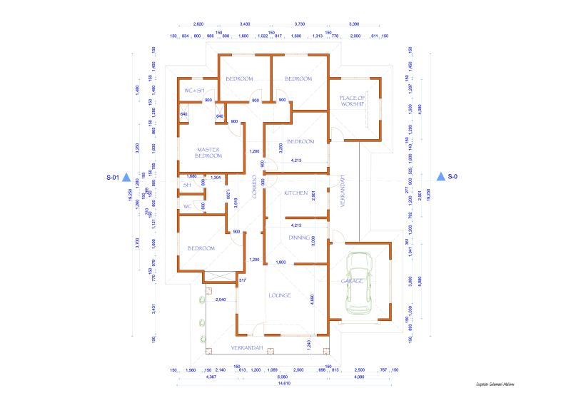My Five Bedrooms Residential House Design also Includes Two Verandas(Main Entry Veranda and Kitchen Veranda), Car Park(Garage), Lounge, Dining, Kitchen, Public Bathroom(Bath & Toilet), Four Bedrooms(Not Self Contained) and Master Bedroom(Self Contained) which it means that it has Five Bedrooms. It has also Place of Worship(Prayer Room) allows other People to enter for that worshiping(Prayers) too.