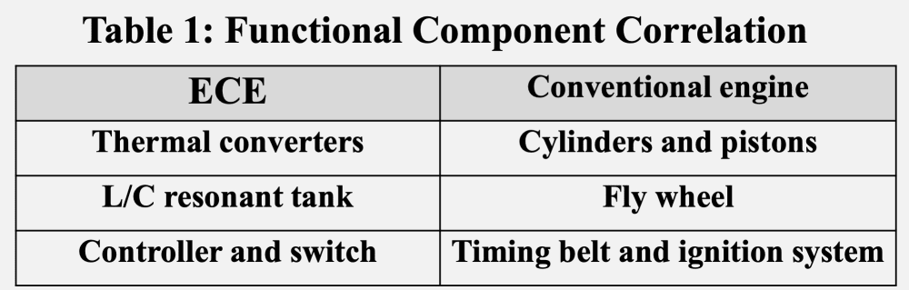Table 1 displays correlations in functional components between an ECE and a conventional (piston) engine.