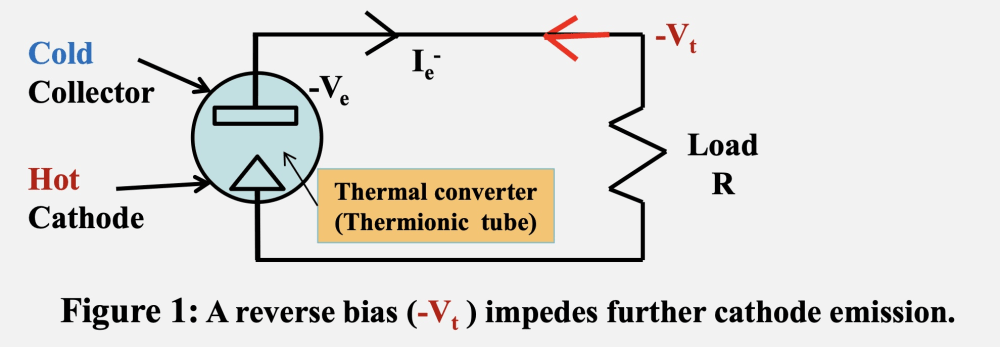 Take thermionic tube, a typical thermal converter, as an example, current (Ie-) flows across the load R (Figure 1) and results in a terminal voltage (-Vt) in the direction opposite to the cathode emission voltage (-Ve), i.e., reverse bias. (Figure 1)