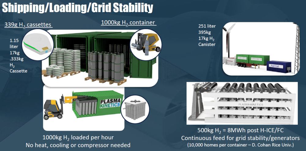 The current leading contender seems to be the magnesium-coated thin film technology developed by Plasma Kinetics (see illustrations). This technology uses thin films that are coated on both sides with a series of materials which enable it to absorb the hydrogen at room temperature and pressure. Once the hydrogen is absorbed, the film can store it for a long period of time. Their long-term study showed that the film can store hydrogen for five years without degradation or loss. The film is rolled into canisters which can be hot swapped when they are empty for full ones. To release the stored hydrogen Plasma Kinetics uses a laser release mechanism that relies on plasmonic heating of the thin film. This method is more efficient than thermal release and provides accurate control of the amount of released hydrogen.