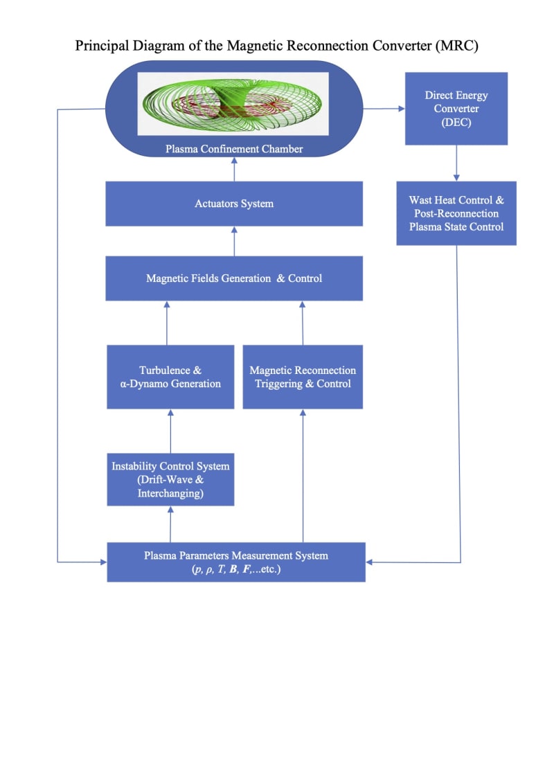 Magnetic reconnection converter (MRC) based on a single-volume plasma (spheromak) with a variable β in the turbulent pumping (charging)/discharging phases of the thermodynamic duty cycle “α-dynamo – magnetic reconnection”. To obtain helpful energy, the proposed MRC uses a cyclic combination of two physical processes: