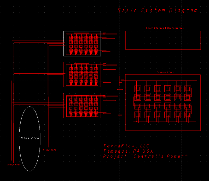 The project proposes to capture and utilize the geothermal heat emanating from the smoldering anthracite coal mine fire, which presents a unique opportunity for energy recovery. By employing clusters of thermal electric generators (TEGs), we intend to convert this heat into electrical energy, maximizing efficiency and sustainability. This process utilizes custom metal alloy rods inserted into the ground around an existing mine fire location and “wicks” the heat to a metal alloy collector block and then, passed to the “hot” side of the TEG modules generating voltage to be stored into a redox flow battery system for further usage or into distribution.