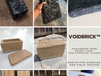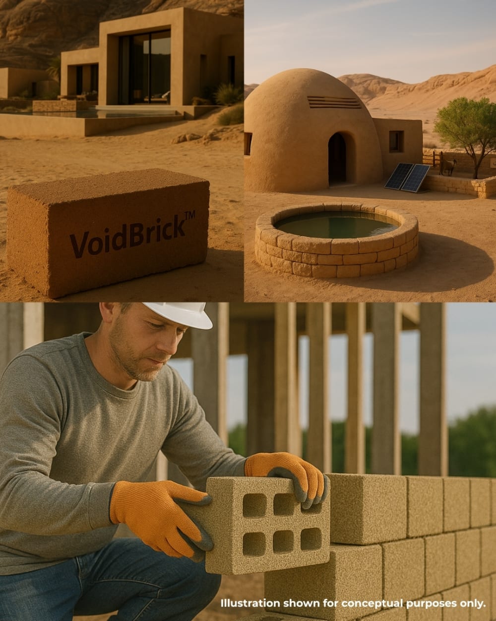 Unlike cement-based products, VoidBrick™ contains no mineral binder and cures at ambient temperature—cutting energy input and embodied carbon. The modular process allows local production using biomass waste or desert sand, enabling construction in regions with limited access to conventional supply chains and aligning with global decarbonization goals. Its lightweight nature and high strength-to-weight ratio make it ideal for temporary and permanent housing alike.