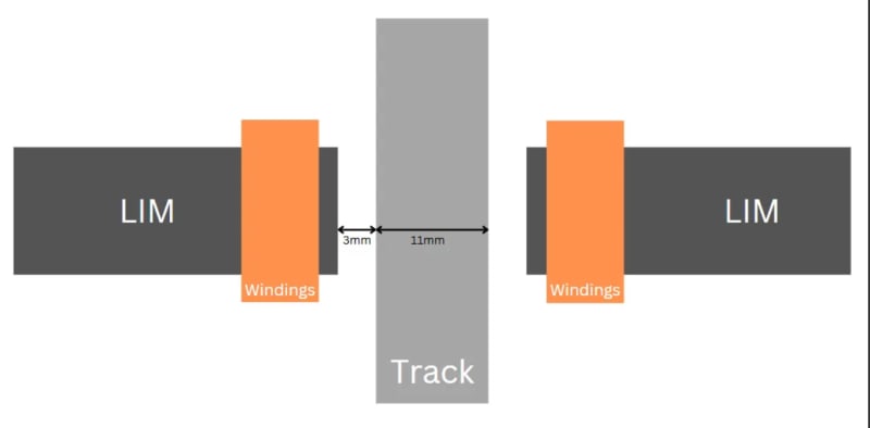 The propulsion system employs a 24-slot, 2-pole, 3-phase DLIM mounted on either side of a paramagnetic aluminium track (Al 6061-T6), creating a travelling magnetic field to generate thrust. In this iteration, each LIM features 25 turns per slot and is powered by a high-current IGBT inverter system delivering 3-phase AC. The system produces a peak force of 43 N, reaching 6.88 m/s (24.77 km/h) in 20 seconds, with a total mechanical output of 300 W at 95% efficiency. Crucially, the proposed 3 mm air gap balances high magnetic coupling with manufacturability and safety, while inter-motor magnetic coupling enhances stability and performance—an improvement over conventional LIM setups.