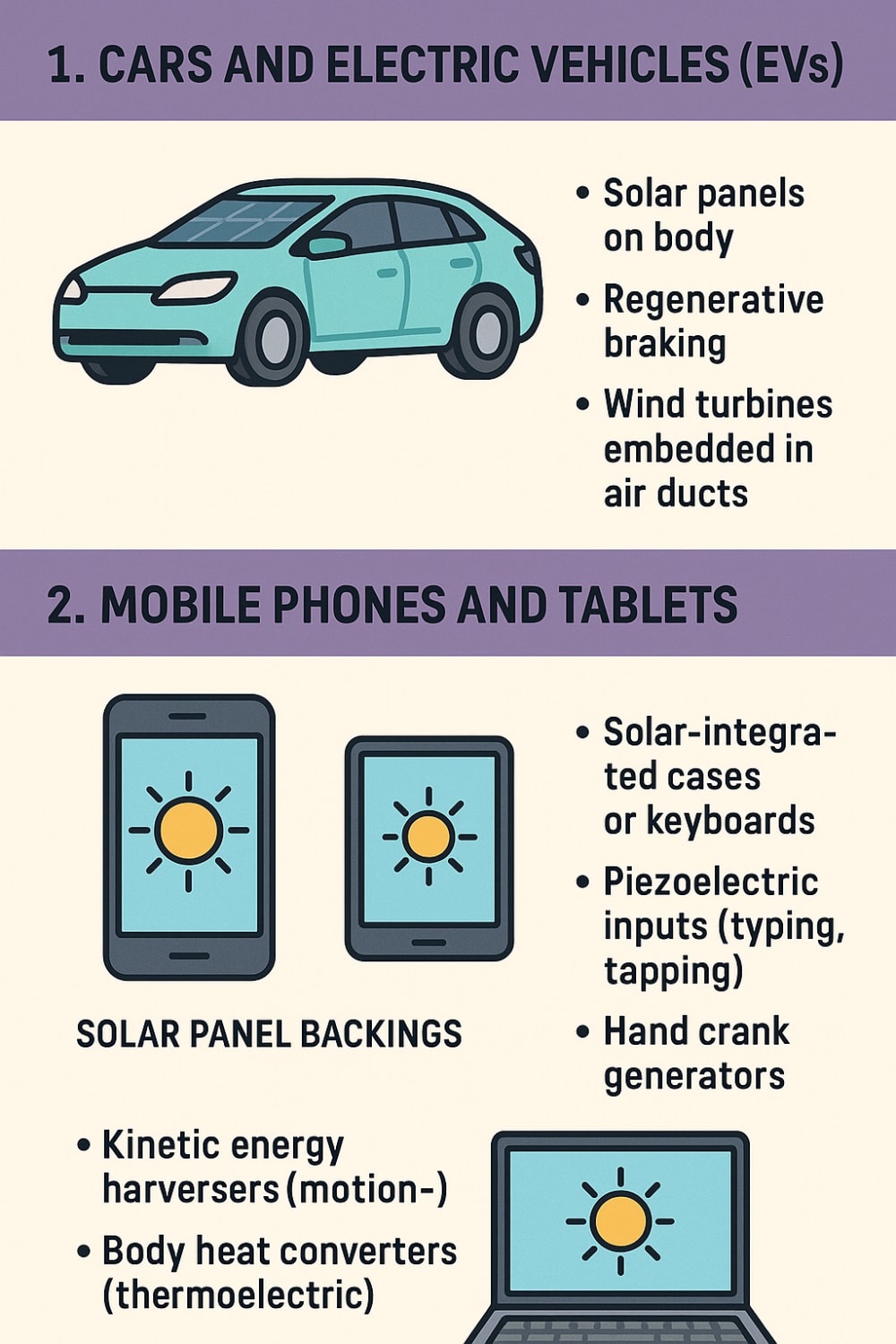 Currently powered by large batteries or fuel, cars can incorporate solar panels on the roof or body, regenerative braking systems to capture kinetic energy, and small wind turbines to generate electricity from airflow. These features would reduce the need for frequent charging or refueling. - Mobile Phones and Tablets: