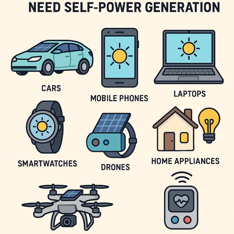 Many modern devices and machines rely on external power sources such as batteries, fuel, or electricity from the grid. To enhance efficiency, reduce dependency on charging infrastructure, and enable operation in remote or emergency conditions, these devices could be equipped with self-power generation systems. Below is a description of various categories of materials or equipment that require power and how they could integrate self-powering solutions: