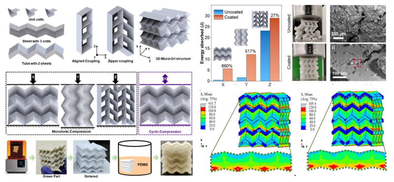 Our innovation directly addresses this challenge by engineering ceramic structures based on the Miura-ori, a natural origami pattern known for its multi-stability, auxetic behavior (negative Poisson's ratio), and tunable mechanical characteristics. These complex ceramic origami structures are fabricated using slurry-based stereolithography (SLA) 3D printing, a novel method that enables the creation of intricate designs previously impossible with traditional ceramic machining or casting, due to the brittle nature and high melting temperatures of ceramics. Our key advancement lies in coating the 3D-printed Miura-ori ceramic structures with a biocompatible hyperelastic polymer, polydimethylsiloxane (PDMS). This polymer coating, applied uniformly via dip coating under vacuum, effectively mimics the toughening mechanisms found in nature, such as nacre (mother-of-pearl), where a soft organic matrix reinforces brittle mineral platelets to enhance toughness.