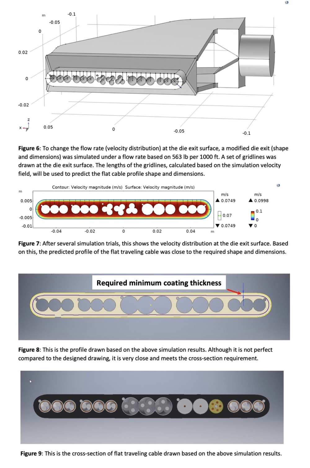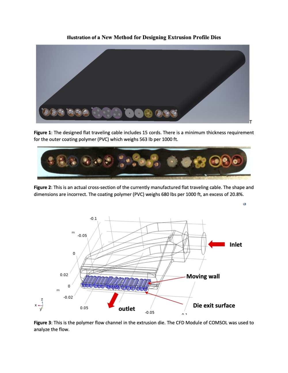 This entry provides an example to illustrate how this method improves the extrusion die design of a current flat traveling elevator cable. The current extrusion die for the flat cable was previously designed based on the cross-section of the flat cable. The design nominal weight of PVC for the flat cable was 563 lb/1000 ft. Due to the dimensions of the extruded cable not meeting all requirements, an increased PVC flow rate has been used during extrusion, resulting in the actual flat cable weight being 680 lb/1000 ft on average. This means 20.8% excess material is used, and the cross-section dimensions are oversized. The following illustration shows how a new method helps identify defects in the die design and make improvements to meet all dimensional requirements.