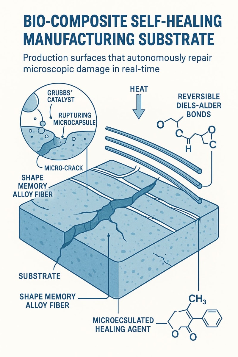 The Bio-Composite Self-Healing Manufacturing Substrate (BSHMS) integrates biomimetic healing mechanisms with advanced polymer chemistry to create production surfaces that autonomously repair microscopic damage in real-time. The substrate combines three proven self-healing technologies: microencapsulated healing agents, shape memory polymers, and reversible covalent bonds.