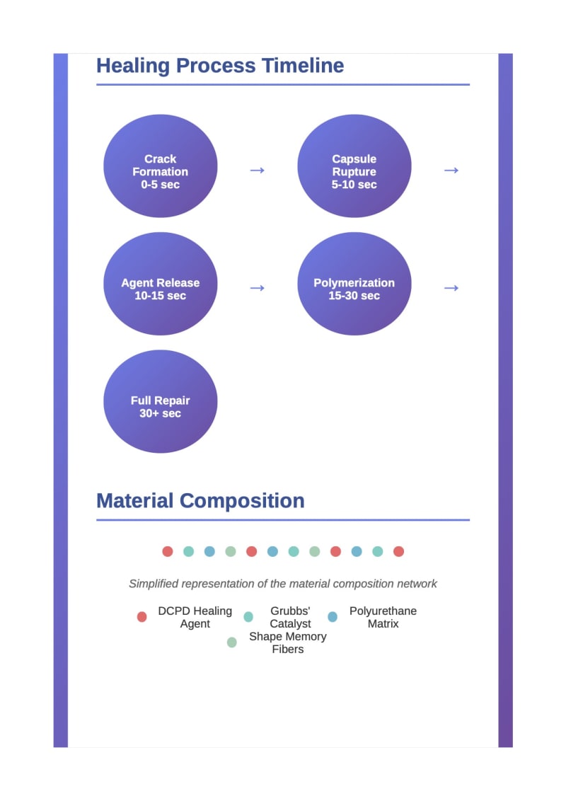 Laboratory testing demonstrates successful healing of 10-500 micron cracks within 30 seconds. Cyclic loading tests show maintained healing efficiency after 75 damage-repair cycles. Thermal stability testing confirms operation between -20°C to 180°C. Compatibility testing with common manufacturing chemicals (cutting fluids, cleaning agents) shows no degradation in healing performance.