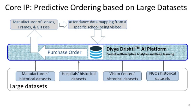 - SaaS Platform (Divya Drishti™): The business model is to go from producer to consumer in one step using the Optometrist as the channel thereby optimizing the long supply chain. This secure AI platform will consist of large, anonymized datasets with millions of past records over 5+ years from eye hospitals, vision centers, manufacturers, and NGOs to predict and ship the frames/lenses required for a given population of students in a school. The dataset required would consist of age, gender, OD/OS SPH/CYL/Axis related to the lenses, and frame size, shape, and color. The platform will provide data visualization, dashboard analytics, billing/payment processing, and information retrieval. It will provide training and Continuing Education for the parents, teachers, and optometrists and will automate the entire process, reduce transcription errors, and provide nationwide traceability through robust and secure platform.