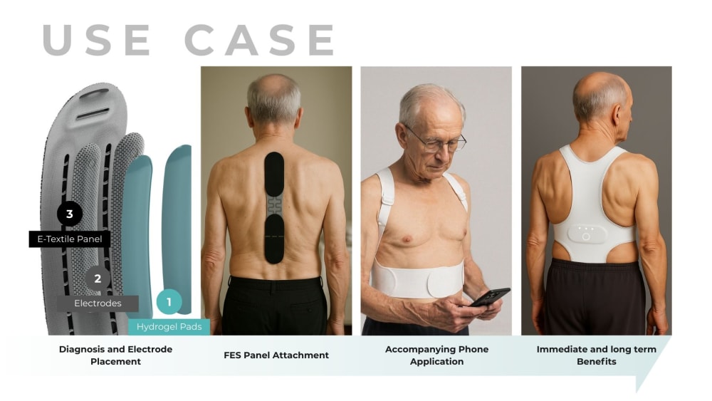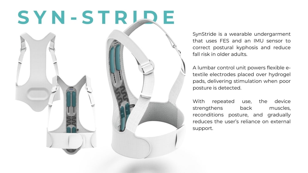 SynStride is a wearable Functional Electrical Stimulation (FES) system integrated into a self-adjustable garment that helps older adults maintain upright posture and reduce fall risk. It uses inertial measurement units (IMUs) to detect excessive forward flexion, typically beyond 40 degrees, and activates four embedded textile electrodes targeting key postural muscles, including the erector spinae and trapezius. SynStride delivers gentle, therapist-calibrated stimulation to engage the muscles progressively. This promotes muscle activation without discomfort, enabling the user to gradually build strength, improve endurance, and retrain neuromuscular pathways. Over time, the user becomes less reliant on the device and can sustain better posture independently for longer periods.