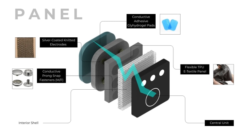 A full-scale functional prototype using off-the-shelf electronics and standard wearable manufacturing materials has been developed (TRL:3). Materials are selected for washability, skin safety, and textile-based scalability, including canvas, elastic nylon webbing, and conductive stretch fabric. The garment design allows modular assembly, simplifying production and user maintenance.