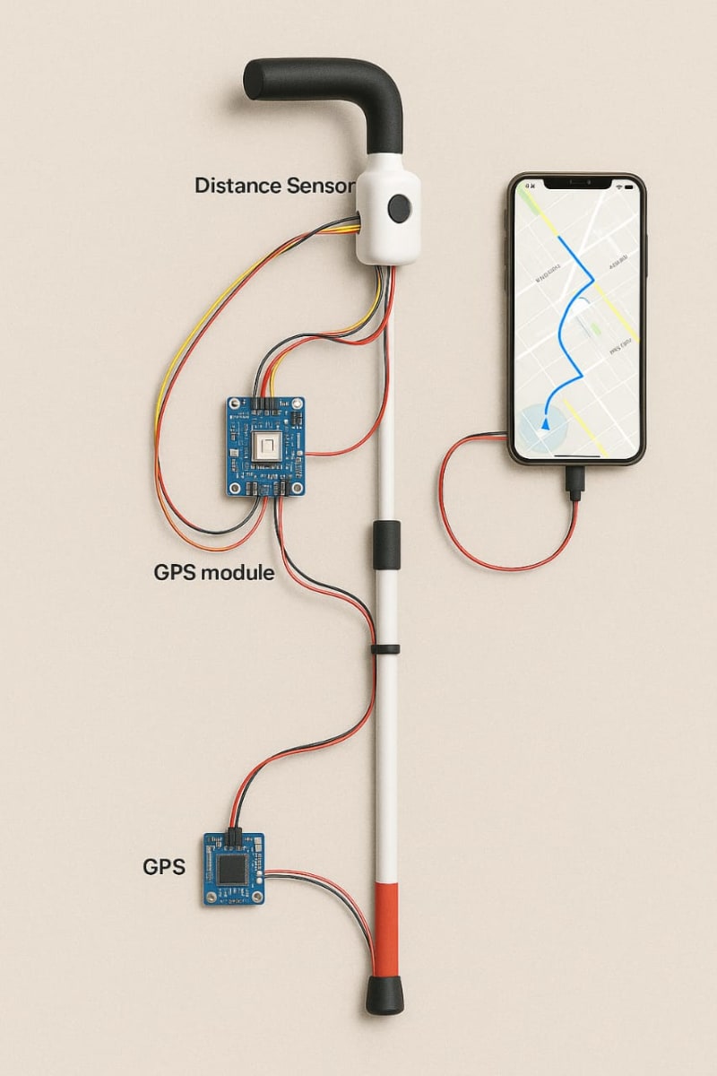 It integrates ultrasonic or infrared sensors, a GPS module, and wireless communication via Bluetooth to provide real-time feedback on the surrounding environment. With ergonomic design and adaptive features, this cane aims to minimize accident risks and enhance independence in both public and private areas.