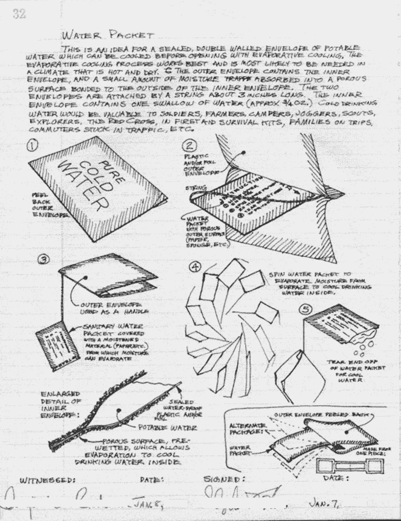 This is an emergency water packet that can provide chilled drinking water to soldiers, fire fighters, athletes, hikers, cyclists, campers, scouts, Red Cross, and commuters stuck in traffic.