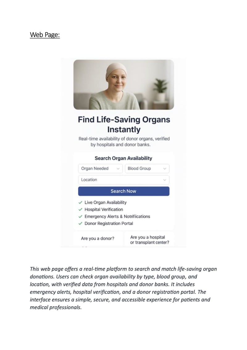 The system integrates decentralized blockchain infrastructure to facilitate transparent communication and coordination between Organ Procurement Organizations (OPOs), hospitals, and transplant centers. Key processes such as donor registration, organ matching, and recipient tracking are securely recorded on a blockchain, eliminating the risk of fraud or unauthorized manipulation.