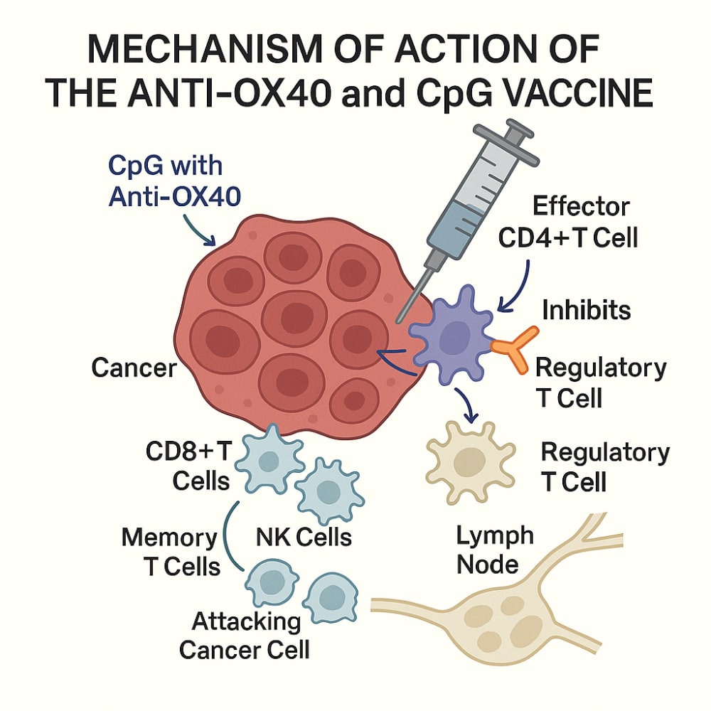 This project describes the development of a novel cancer immunotherapy vaccine designed to cure tumoral cancers in dogs. This vaccine is unique since the dog must have cancer for it to work. The vaccine employs a combination of an agonist anti-OX40 monoclonal antibody and a CpG oligodeoxynucleotide (ODN), delivered intratumorally. Its mechanism of action leverages the tumor microenvironment as the antigen source: the CpG stimulates upregulation of OX40 on effector CD4+ T cells while the anti-OX40 monoclonal antibody binds and dampens regulatory T cell (Treg) responses, effectively “releasing the brakes” on immune activation. This results in robust stimulation of cytotoxic CD8+ T cells and NK cells, driving local and systemic tumor destruction and formation of durable anti-tumor immune memory.